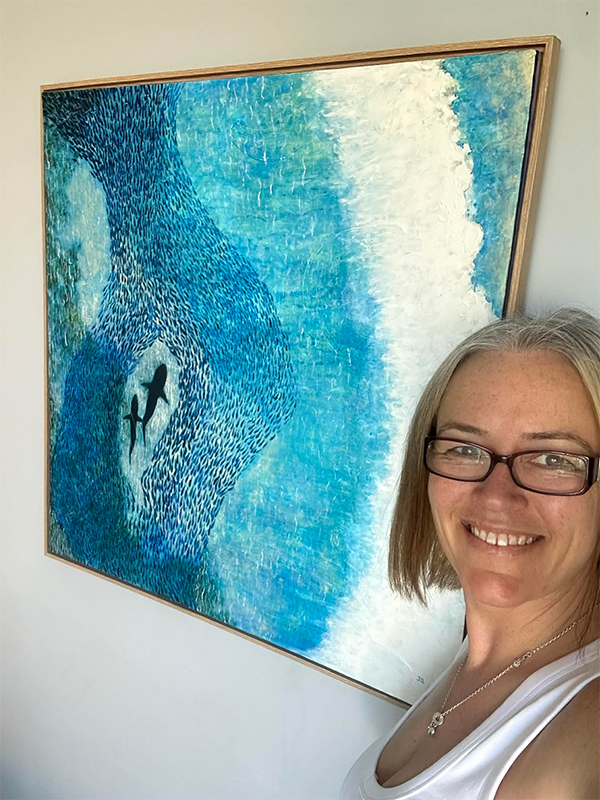 I have always been enthralled at the sight of the sharks in the feeding frenzy with schools of surface fish. My 1.5 million surface fish in the painting (lol) are a bit bigger in size then those you might see in photographs. I did try smaller ones but it was too painful on my eyes so I pulled the artist licence card and made them bigger.