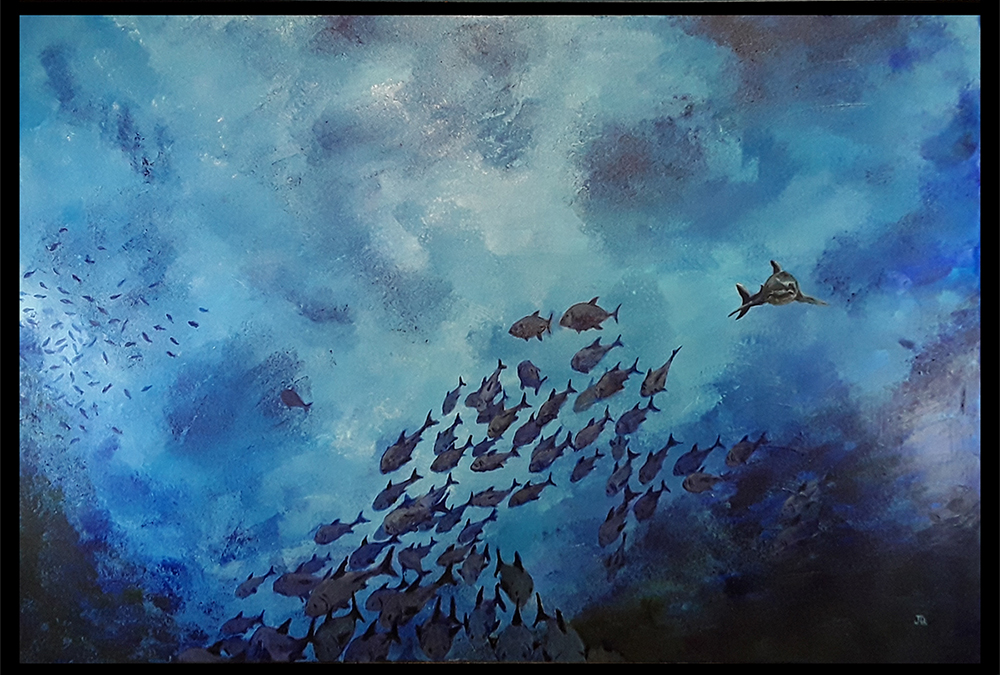 This is another painting along a bit of a theme I find myself enjoying. Great Whites getting amongst large schools of scarpering fish. This one is from an angle of the school making their escape from the fast approaching and hungry shark.